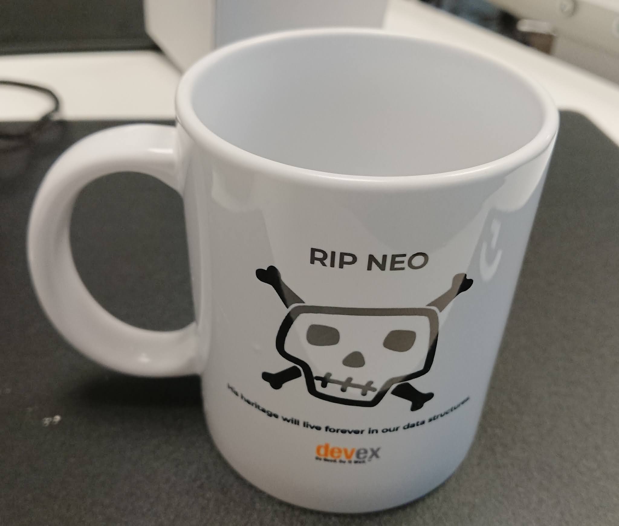 We got a present from our CEO while he was visiting the Barcelona Devex office this week....| RIP Neo Mug |