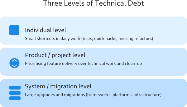 At the project level — whether you call it an initiative, epic, cycle, or sprint — technical debt often appears when product delivery takes priority over internal improvements.